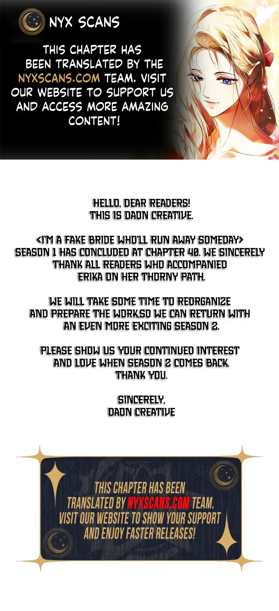 I’m A Fake Bride Who’ll Run Away Someday Chapter 40.5 - s1 ended includes 1 comic pages in the main reading order. Published March 25, 2026 and updated March 25, 2026.